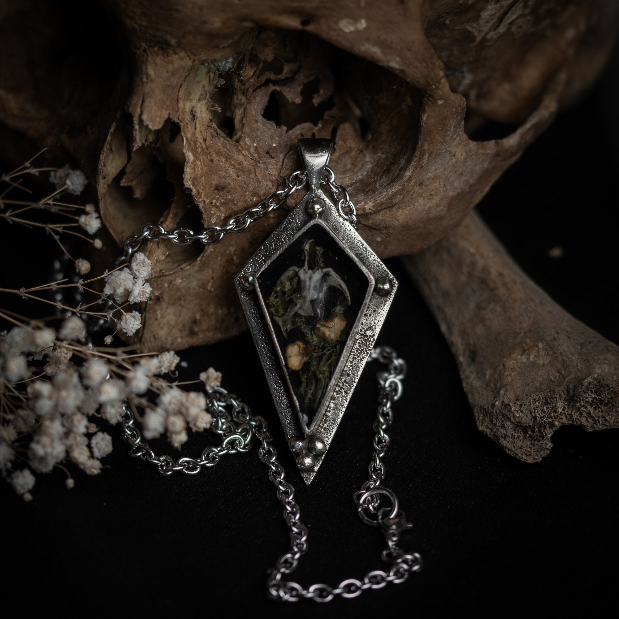 Material: Brass pendants, stainless steel chains, mouse skulls, moss and dried flowers