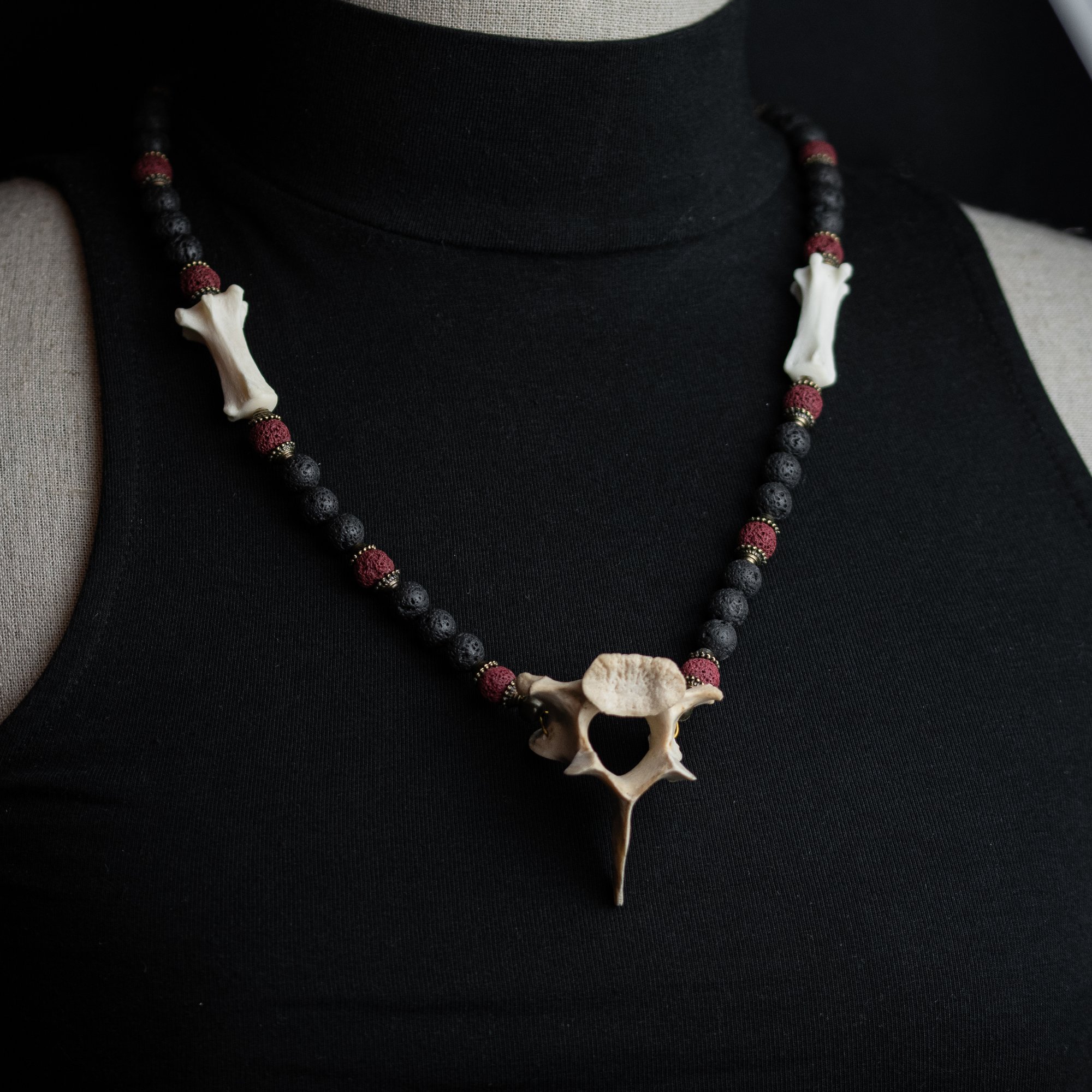 The Lava Bead Necklace features real animal bones along red and black lava beads.